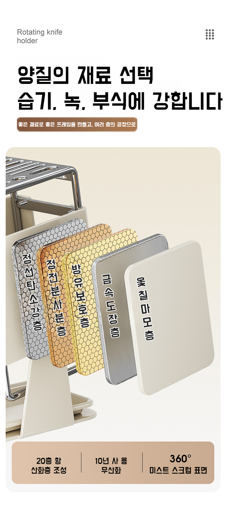 회전식 스탠드 칼 선반, 공간 절약, 다양한 주방용품 정리, 접시·칼 동시 수납, 오픈형 디자인으로 편리한 사용.